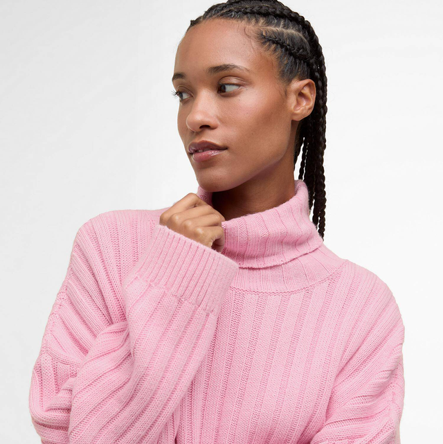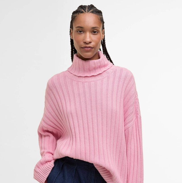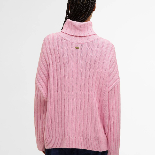 The Barbour Maeve Knitted Roll-Neck Jumper is crafted in a wide rib stitch for a cozy, textured look. Designed with a relaxed fit, it features exaggerated dropped shoulders and wide sleeves for effortless style and comfort. Finished with the signature Barbour slim metal ID bar at the back neck.