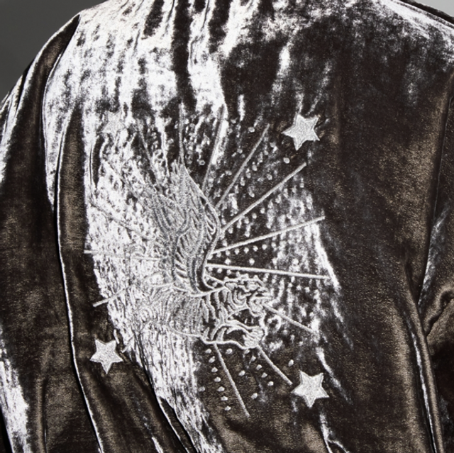 - Iconisch borduursel op de rug: de IMPREVU-tijger in zilverkleurig lurexdraad, als een kostbare handtekening.